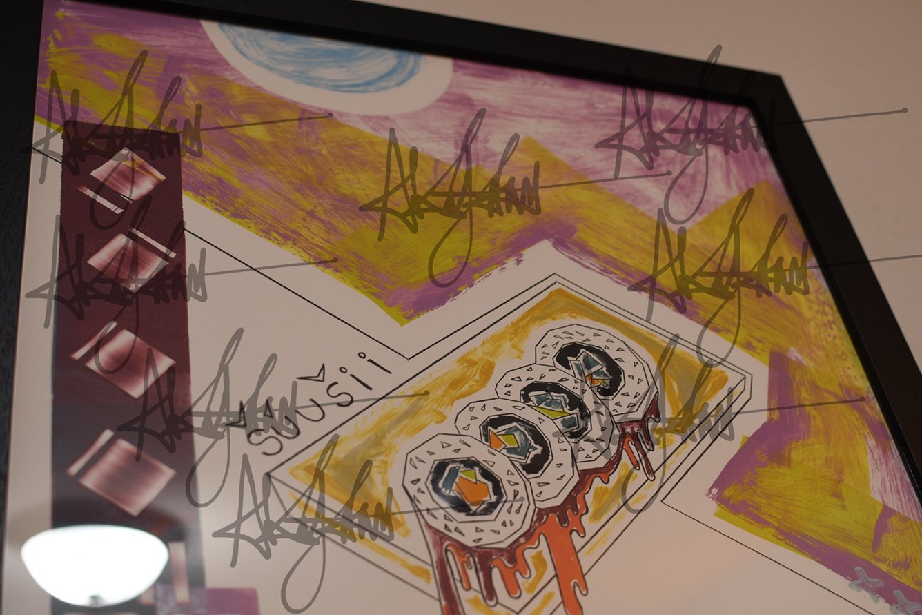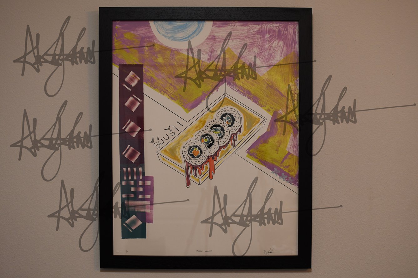 Original 1/1 Monotype archival print of Sushi titled ‘Maggie Incoming’ by Alx Kujana. This one-of-a-kind print was made possible by Crow’s Shadow Institute of the Arts’ (est. 1992) state-of-the-art printmaking studio located on the Umatilla Indian Reservation in Pendleton, Oregon (USA). The master printers involved in aiding Alx with the printmaking machinery and Monotype processes were Maggie Middleton and Judith Baumann.