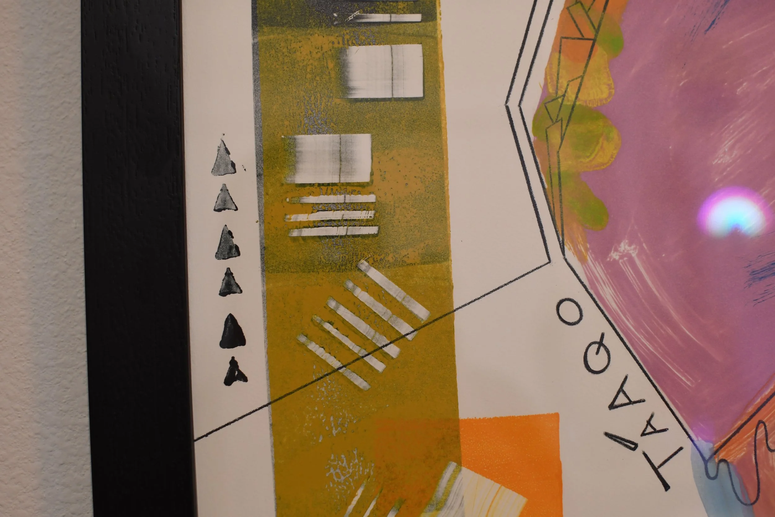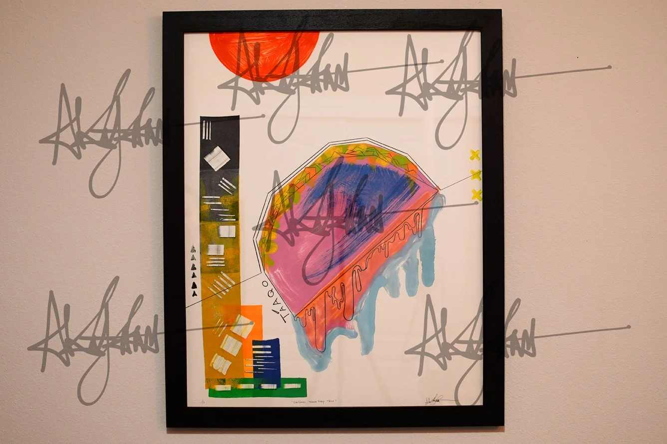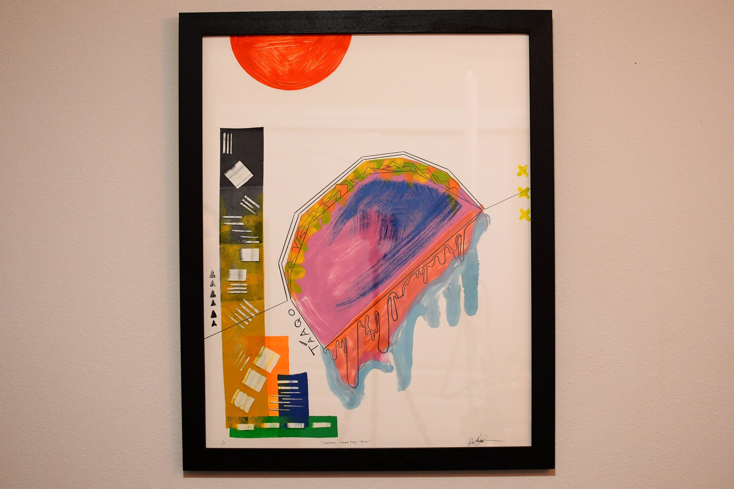 Original 1/1 Monotype archival print by Alx Kujana titled ‘Emotional Trauma Dump Taco’. This one-of-a-kind print was made possible by Crow’s Shadow Institute of the Arts’ (est. 1992) state-of-the-art printmaking studio located on the Umatilla Indian Reservation in Pendleton, Oregon (USA). The master printers involved in aiding Alx with the printmaking machinery and Monotype processes were Maggie Middleton and Judith Baumann.